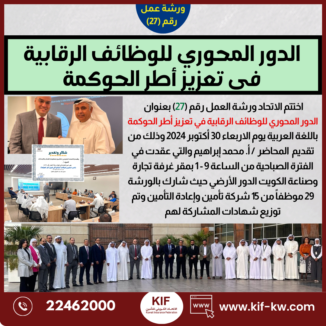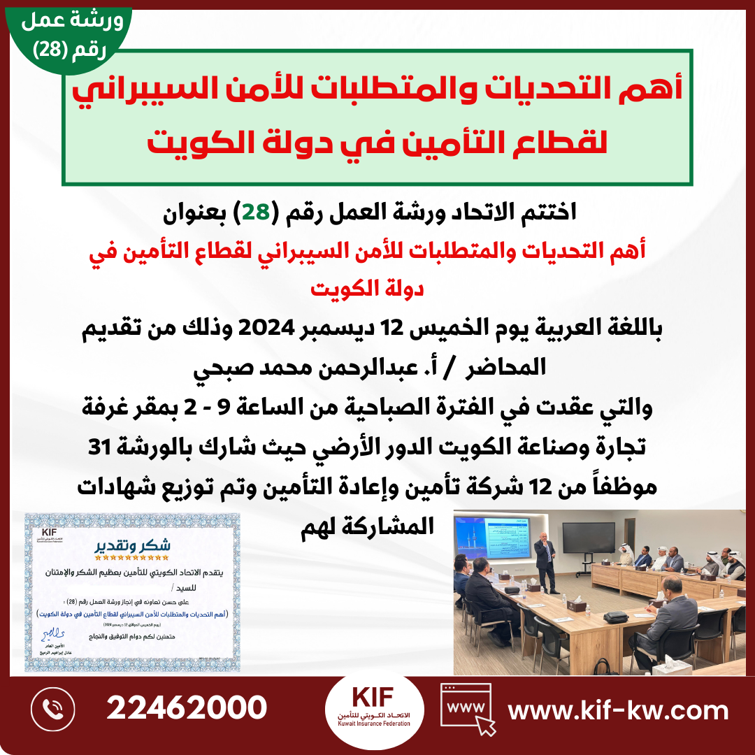 لورشة العمل رقم (28) أهم التحديات و المتطلبات للأمن السيبرانى لقطاع التأمين فى دولة الكويت