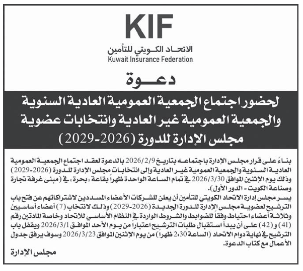 دعوة الإتحاد لحضور إجتماع الجمعية العمومية العادية السنوية والجمعية العمومية غير العادية وانتخابات عضوية مجلس الإدارة للدورة (2026-2029) - جريدة الرأي و جريدة الجريدة التاريخ 22 فبراير 2026